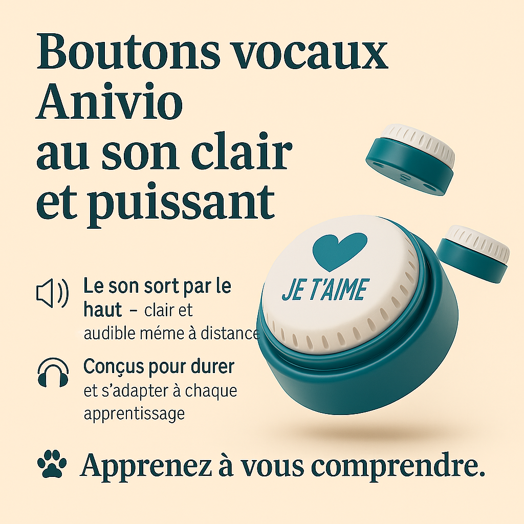 Avec Anivio, votre compagnon apprend à s’exprimer simplement. Chaque pression devient un mot, chaque moment un vrai dialogue entre vous